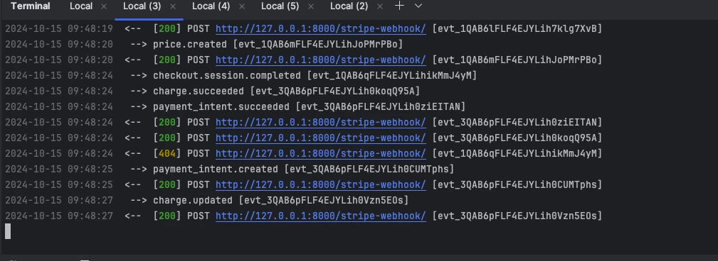 Est-ce que tu peux faire une capture d'écran plus complète de toute la liste d'événements que tu as avec le Stripe CLI ? Et le code plus détaillé de ta fonction aussi sans couper la fin.
