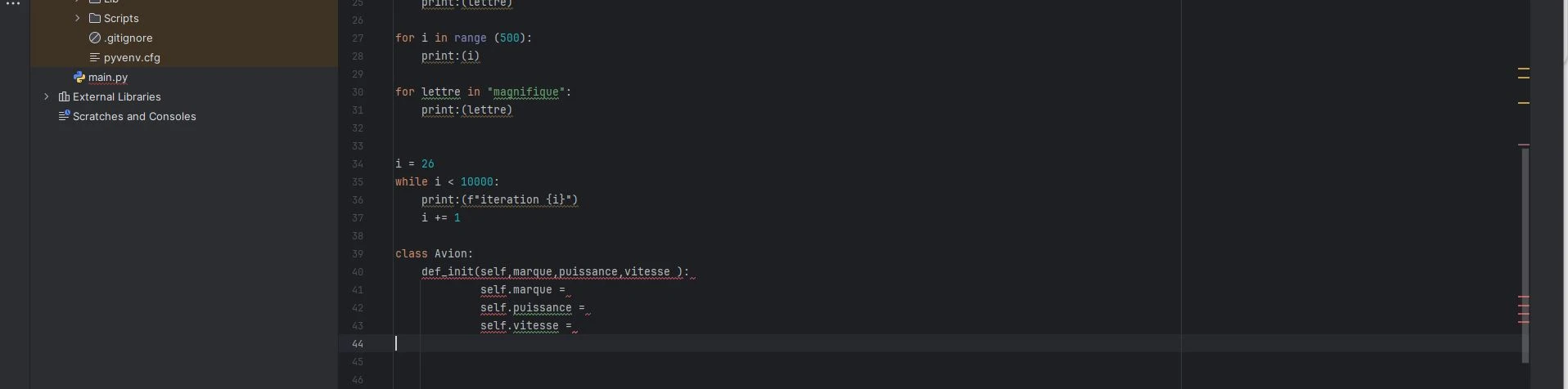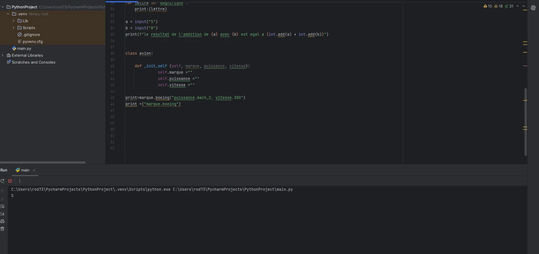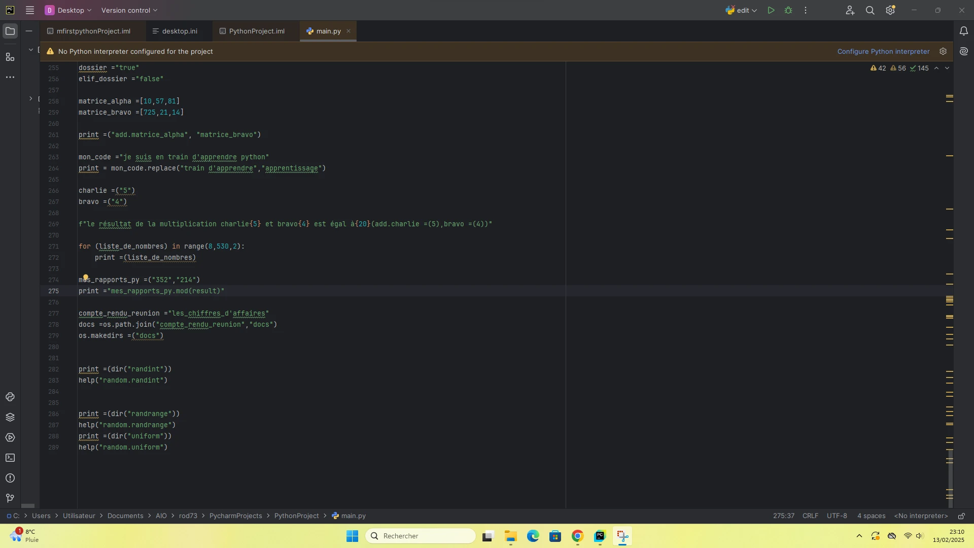 Si tu as autant de soucis avec PyCharm je te conseille vivement d'utiliser un éditeur plus simple comme VS Code. Et de vraiment bien revoir les formations de base.