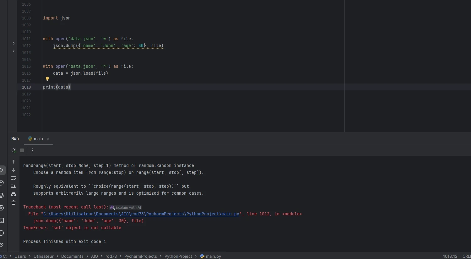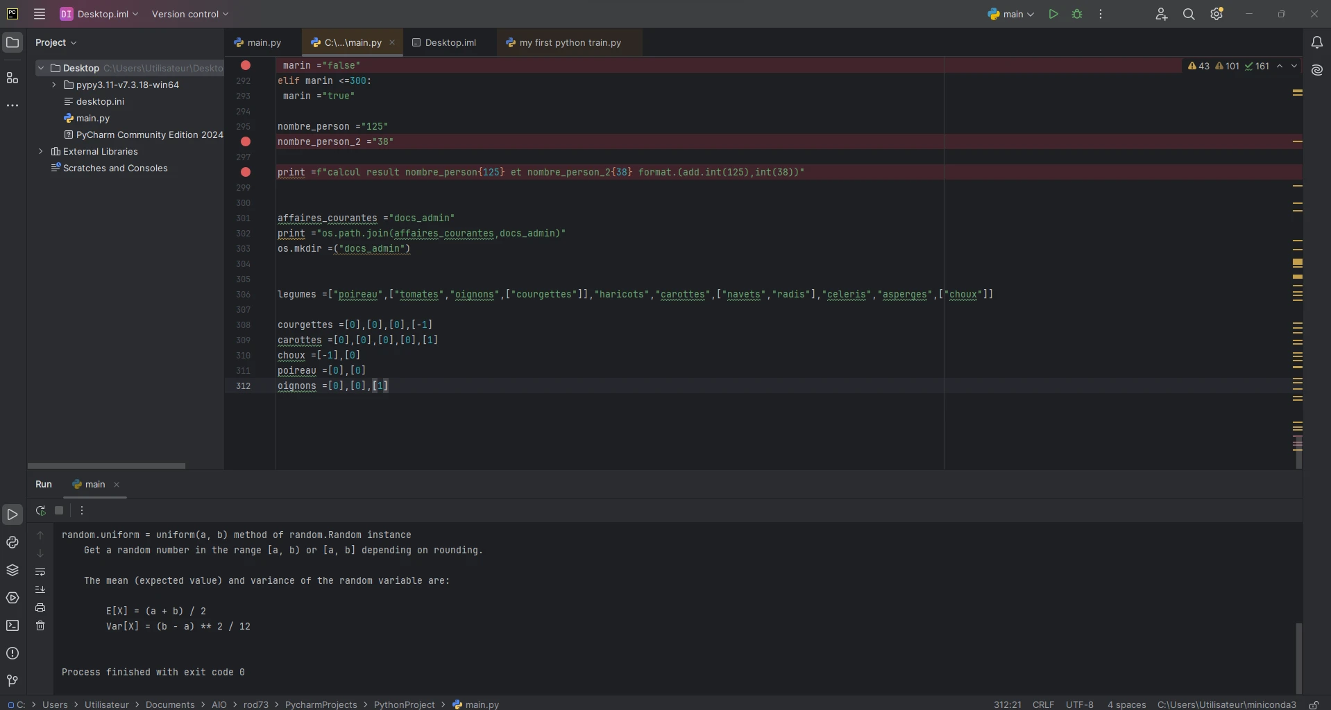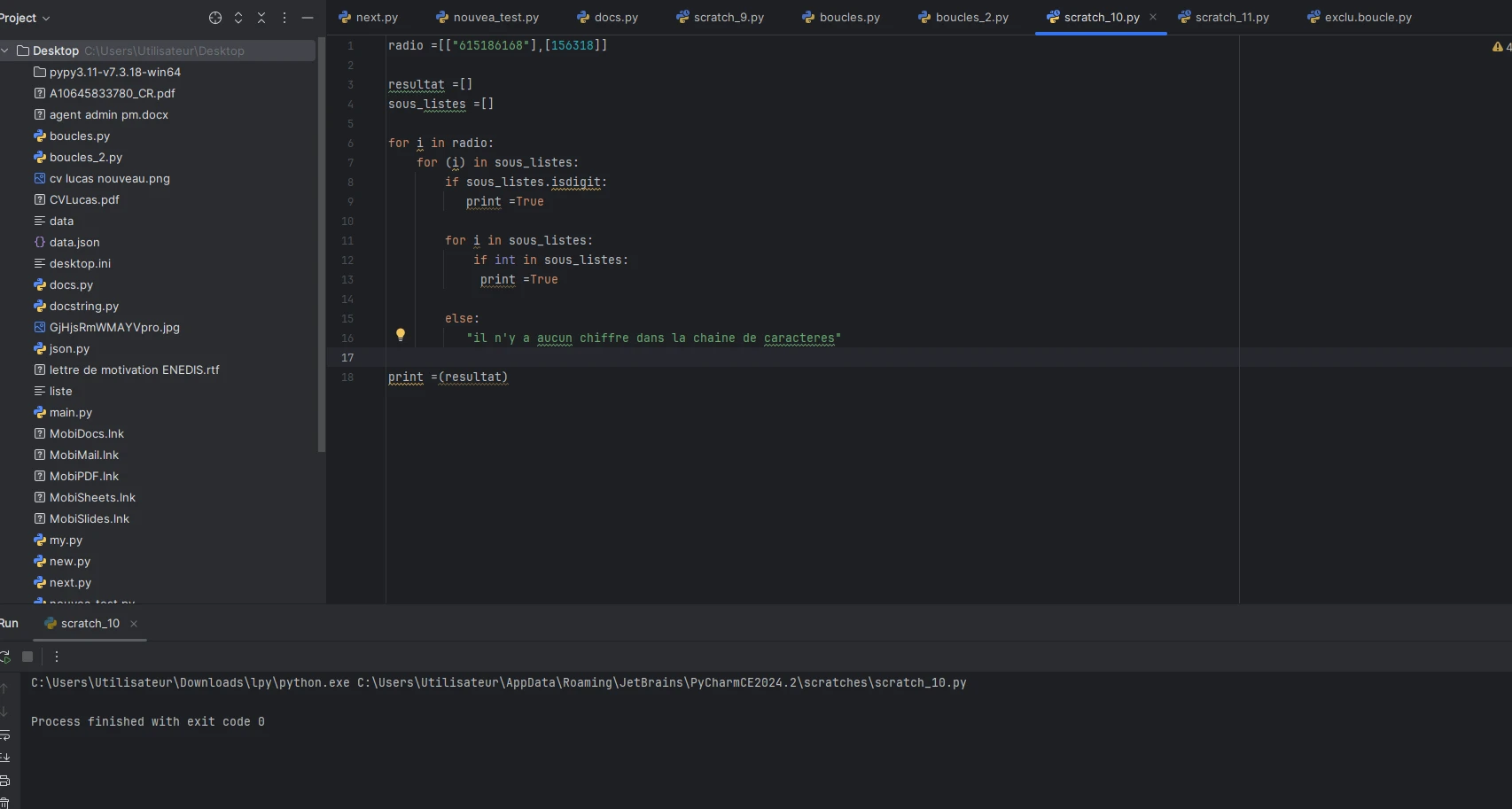 Si tu as autant de soucis avec PyCharm je te conseille vivement d'utiliser un éditeur plus simple comme VS Code. Et de vraiment bien revoir les formations de base.