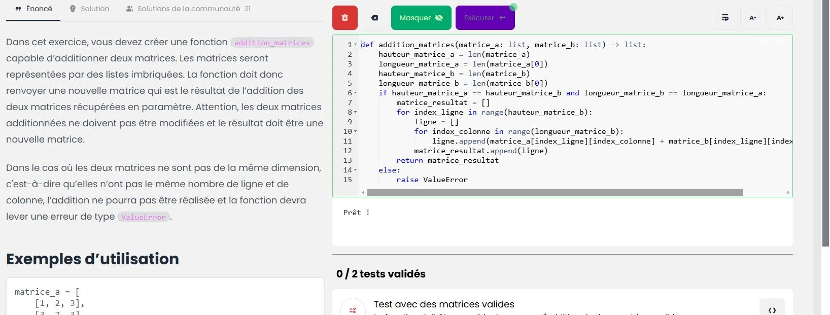 Je vous joins ci dessous ma proposition à l'exercice "additioner deux matrices"
