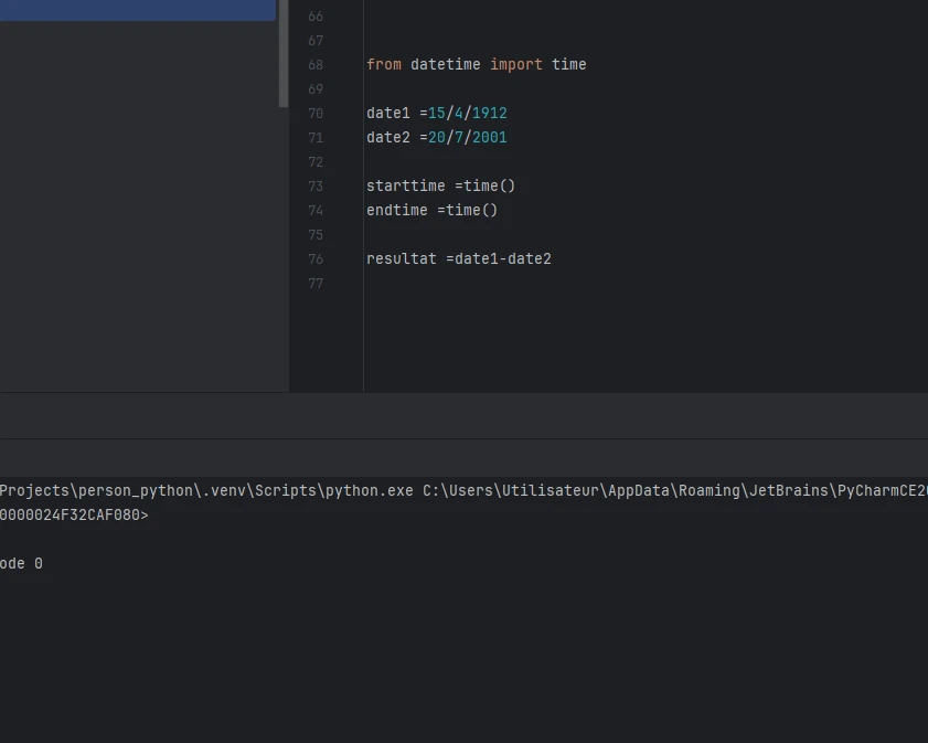 Si tu veux absolument utiliser PyCharm au lieu de Visual Studio Code, regarde notre parcours à ce sujet, ou au minimum cette formation qui parle des configurations et de comment exécuter son code. Je vois que tu ne les as pas regardé donc tu y vas à l'aveugle dans un logiciel complexe.