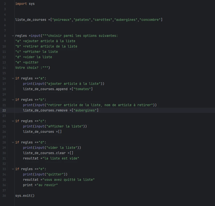liste_de_courses = ["poireaux", "patates", "carottes", "aubergines", "concombre"]