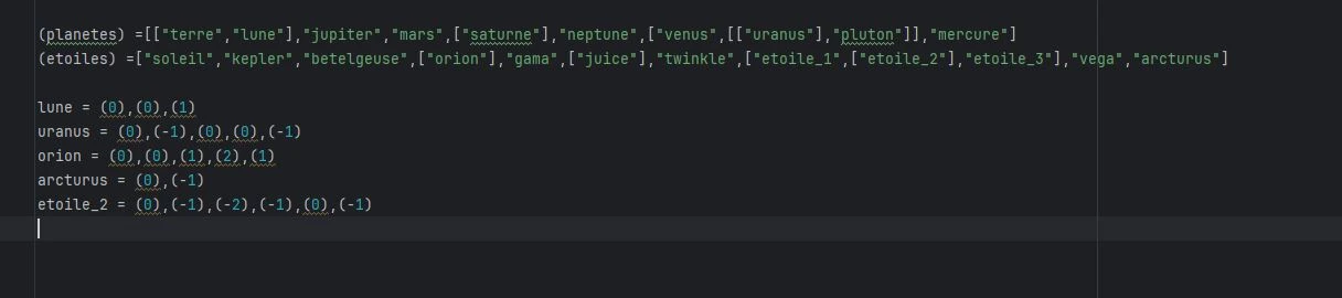 Pour ton programme, pourquoi mettre des parenthèses qui ne suivent pas les conventions ? Tu pourrais écrire planetes et etoiles.