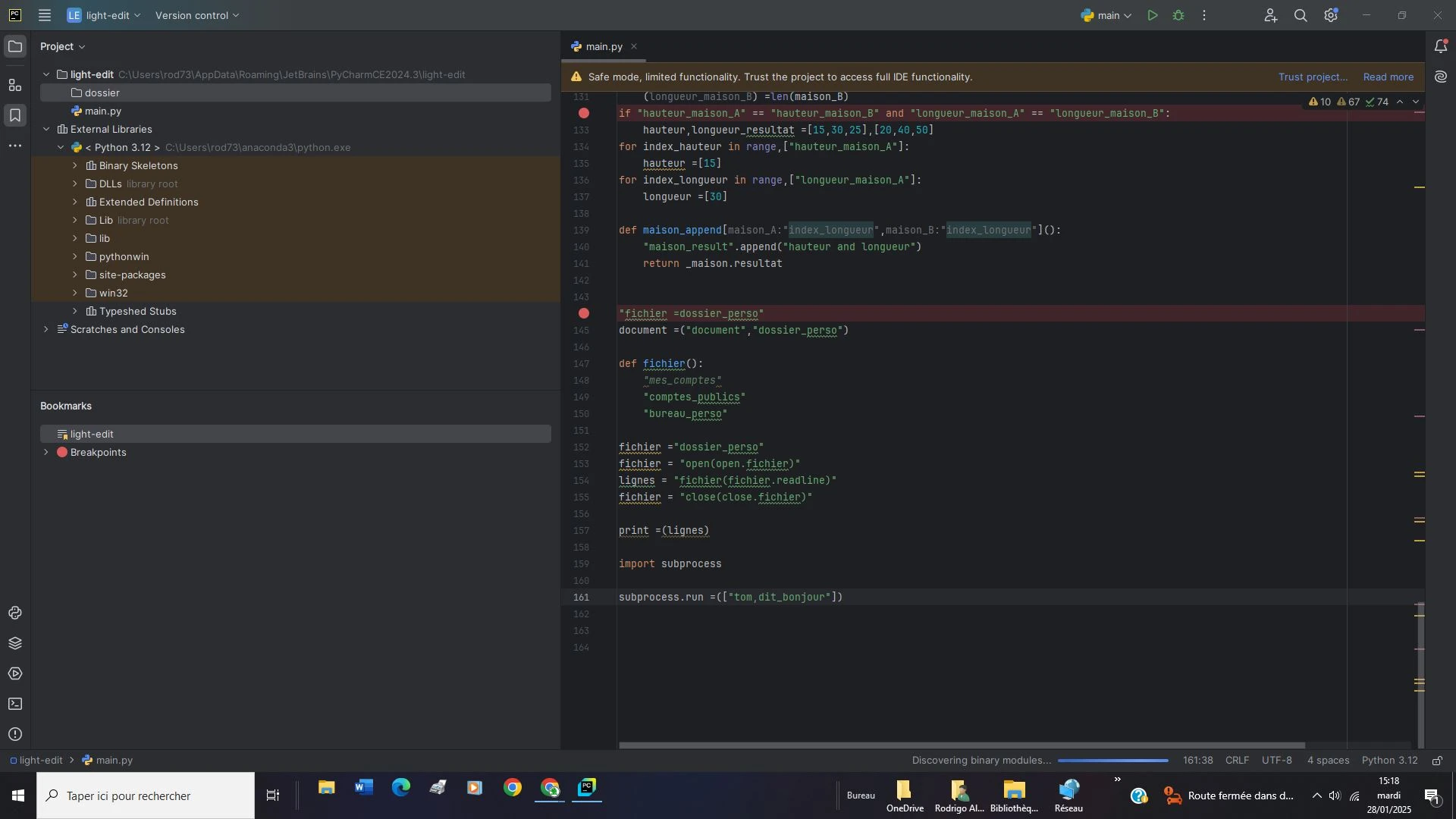 Après un bug de mon ordinateur, tout mon travail pycharm a disparu et il avait pourtant été sauvegardé en fermant la page à chaque fin de mes sessions.