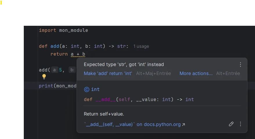 Par contre fait étrange, si j'oublie volontairement d'annoter le paramètre a, PyCharm ne me lève plus de warning sur mon type de retour. Pourquoi ?