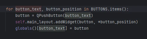 La bonne pratique en PySide (ou en Python en général) est de stocker tes boutons dans un dictionnaire (ex : self.buttons[button_text] = button) car cela garde ton code propre, lisible, sans effet de bord.