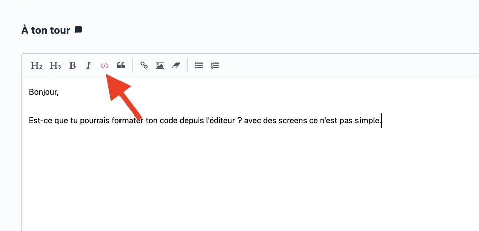 Copie-colle ton code au format texte, en le mettant en forme avec le bouton de code dans l'éditeur, comme te l'as indiqué Gabriel.