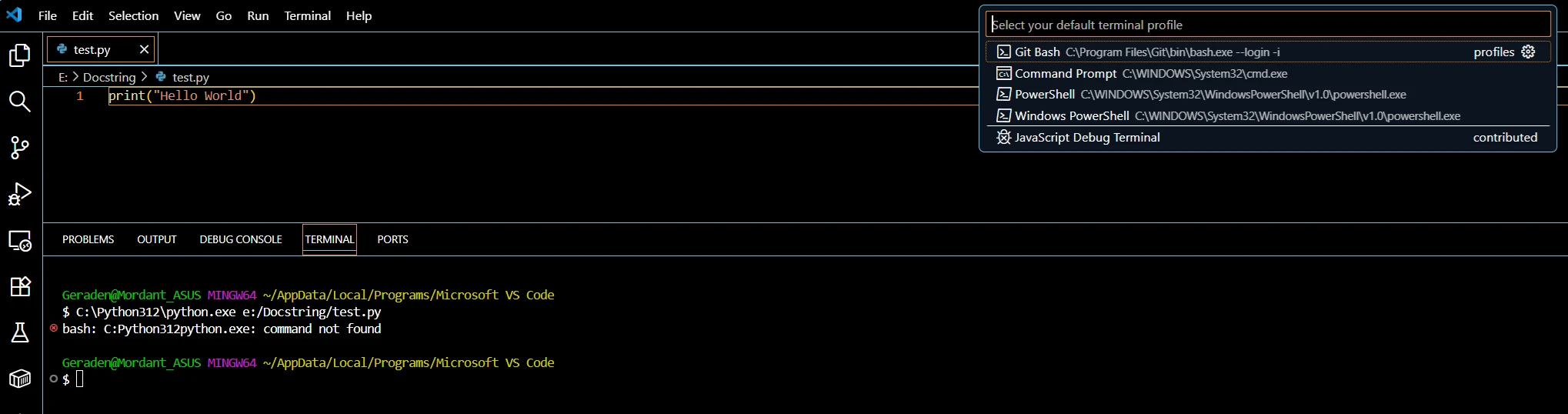 J'ai mis Git Bash en terminal par défaut comme dans ta vidéo.
