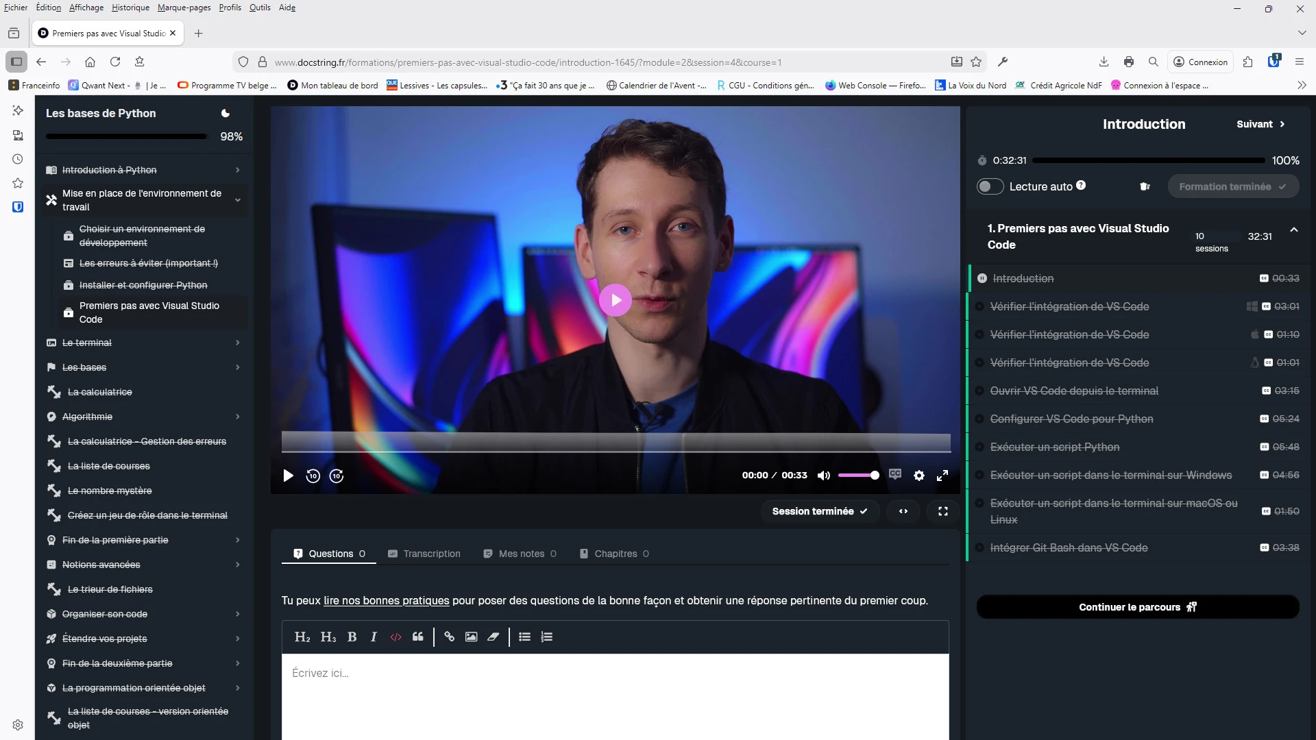 J'ai terminé mon parcours "Les bases de Python". Mais il semble que la rubrique "Premiers pas avec Visual Studio Code" ne soit pas considérée comme terminée puisqu'elle n'est pas barrée à gauche de la copie d'écran alors que toutes les parties ont été terminées à droite de la copie. Cela entraine que je ne peux terminer tout le cursus de "Les bases de Python". Pourquoi STP ?