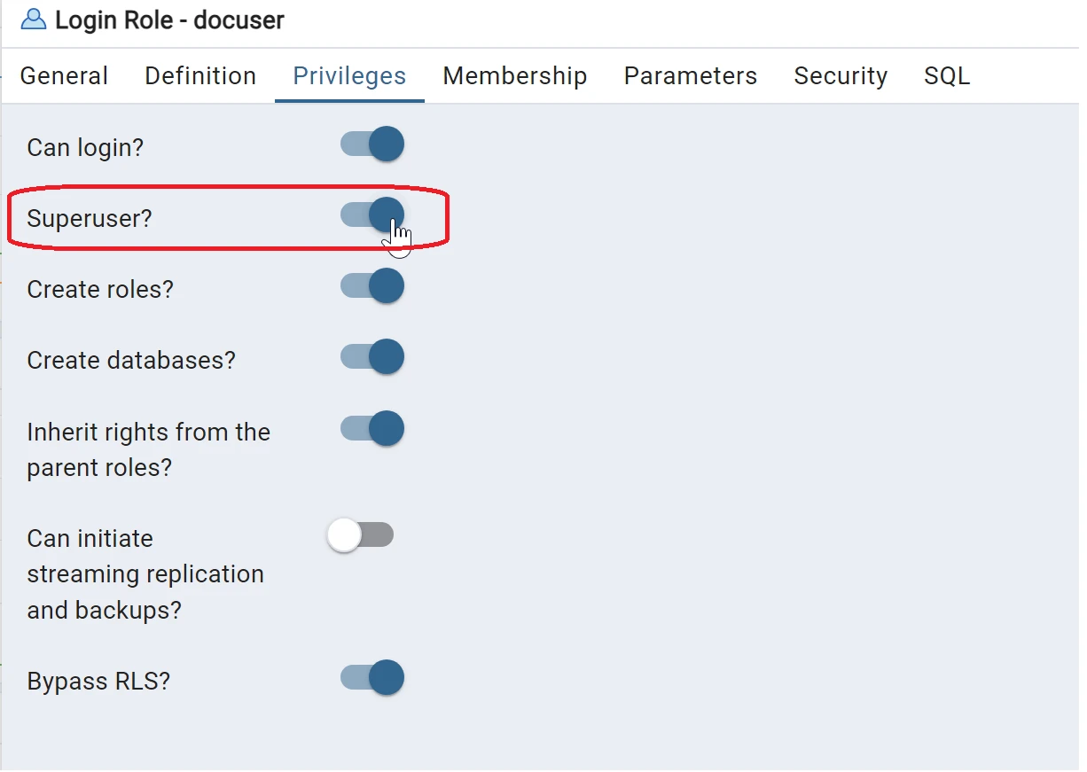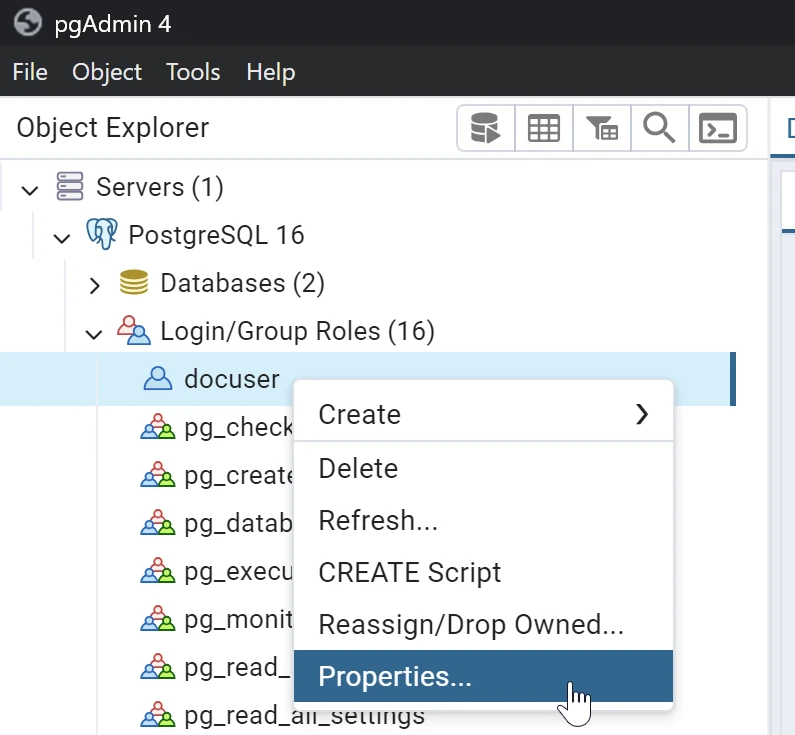 Le plus simple est de passer par l'application pgadmin pour gérer cela sur le user docuser :