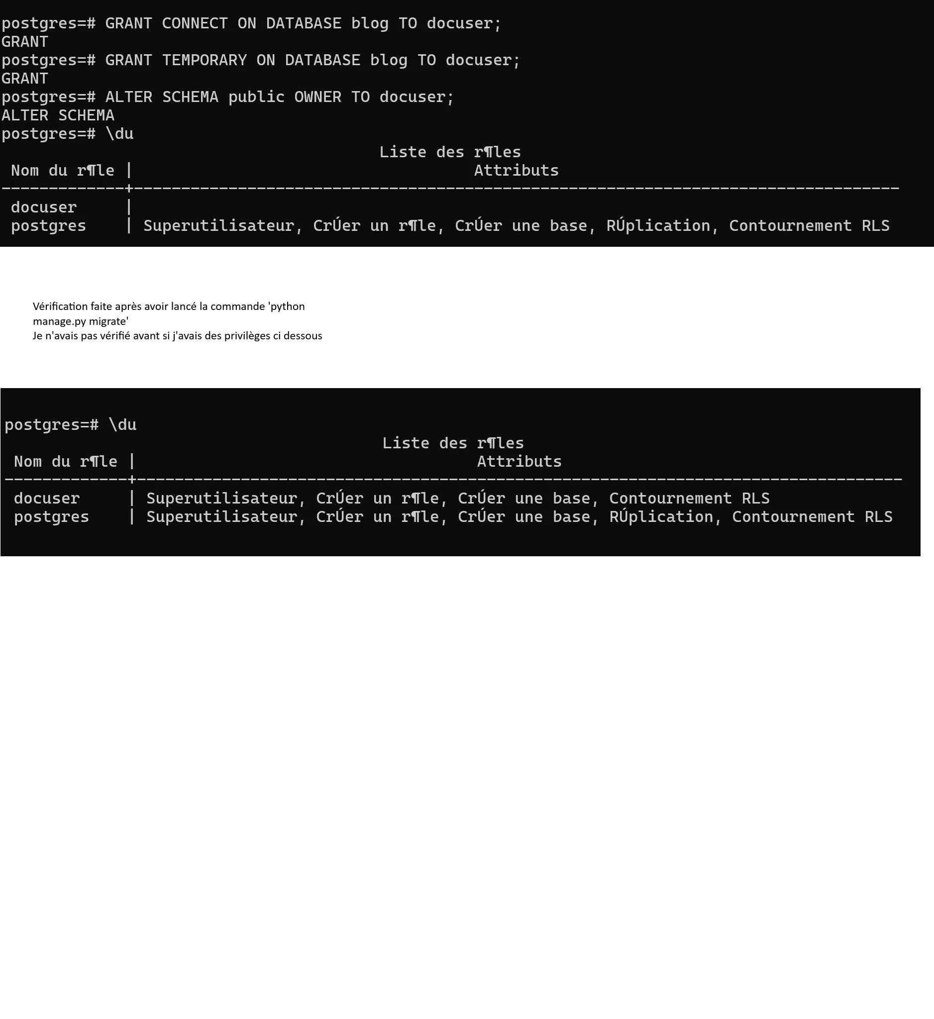 J'ai rencontré le soucis lié au droit que l'on fait : "psycopg2.errors.InsufficientPrivilege:...........".