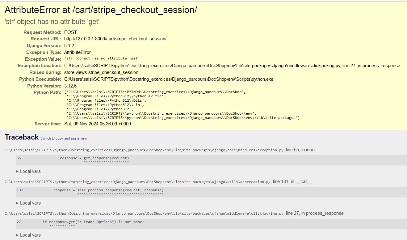 Hello, à mon tour de devenir fou avec Stripe. Je veux relier l'utilisateur qui fait l'achat à un utilisateur Stripe en ajoutant la ligne customer=user.stripe_id dans ma checkout session. Mais quand je rajoute cette simple ligne, la vue (qui s'affichait correctement avant) déclenche une erreur pas très explicite: