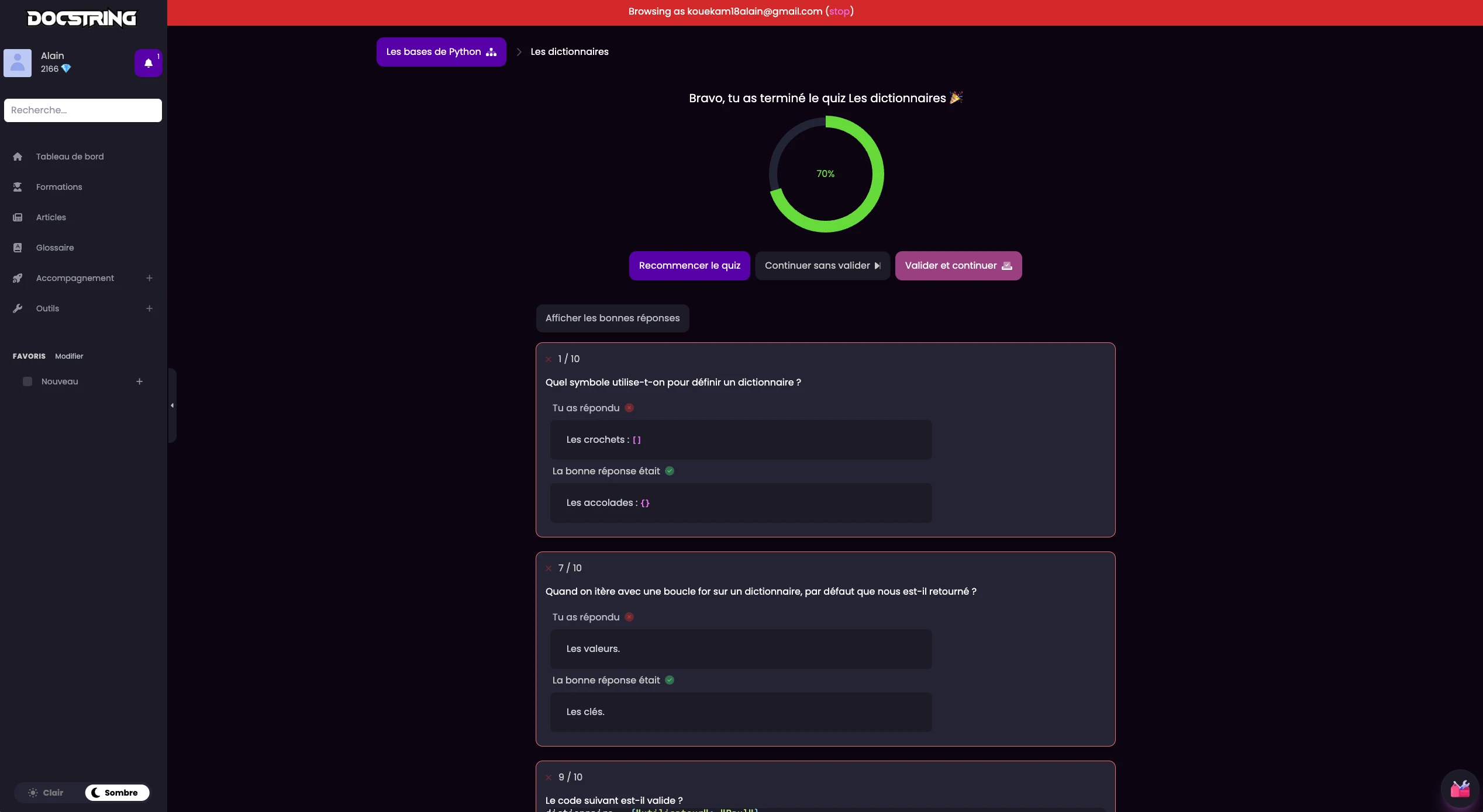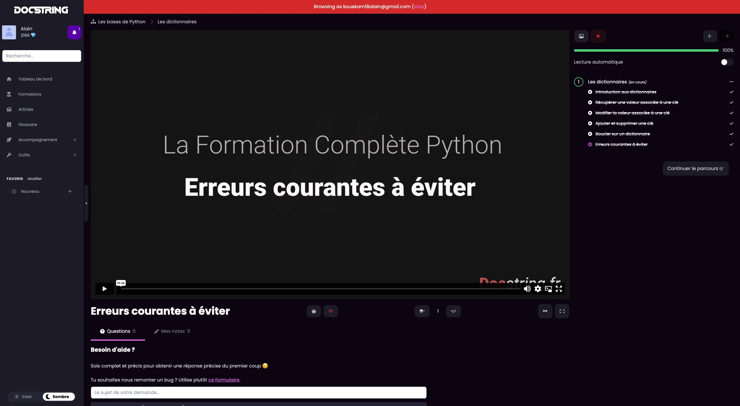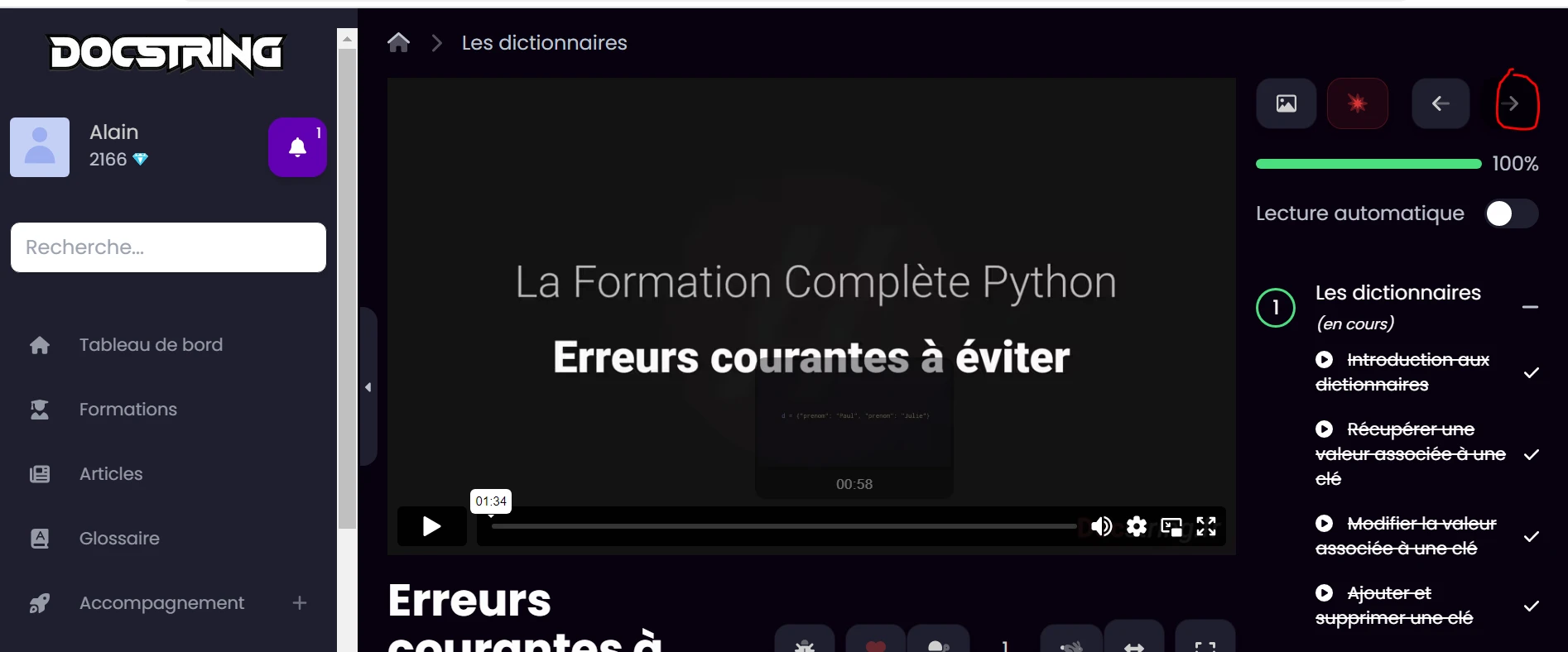 Il s'agit du module dictionnaire. Lorsque j'arrive à la dernière vidéo, je n'arrive plus à avancer c'est à dire aller vers le quizz ou poursuivre la formation