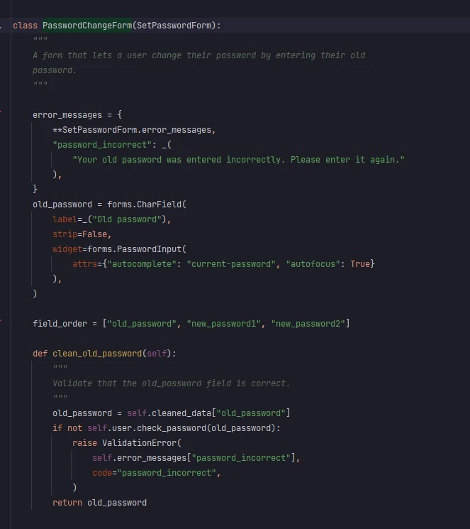 Dans PasswordChangeForm ci-dessous, on a pas de class Meta à partir de laquelle on peut utiliser l'héritage. De plus les "fields" sont définis avec l'attribut field_order.