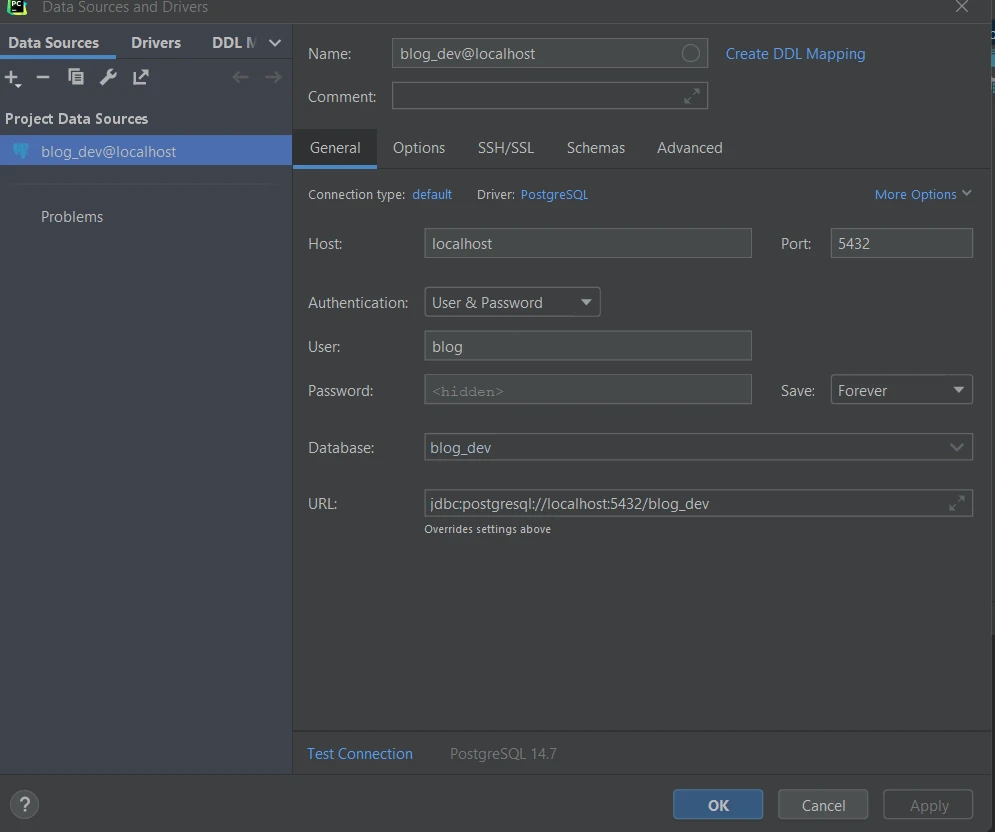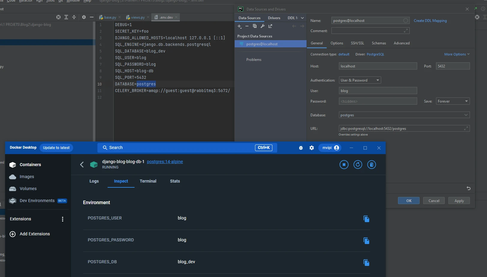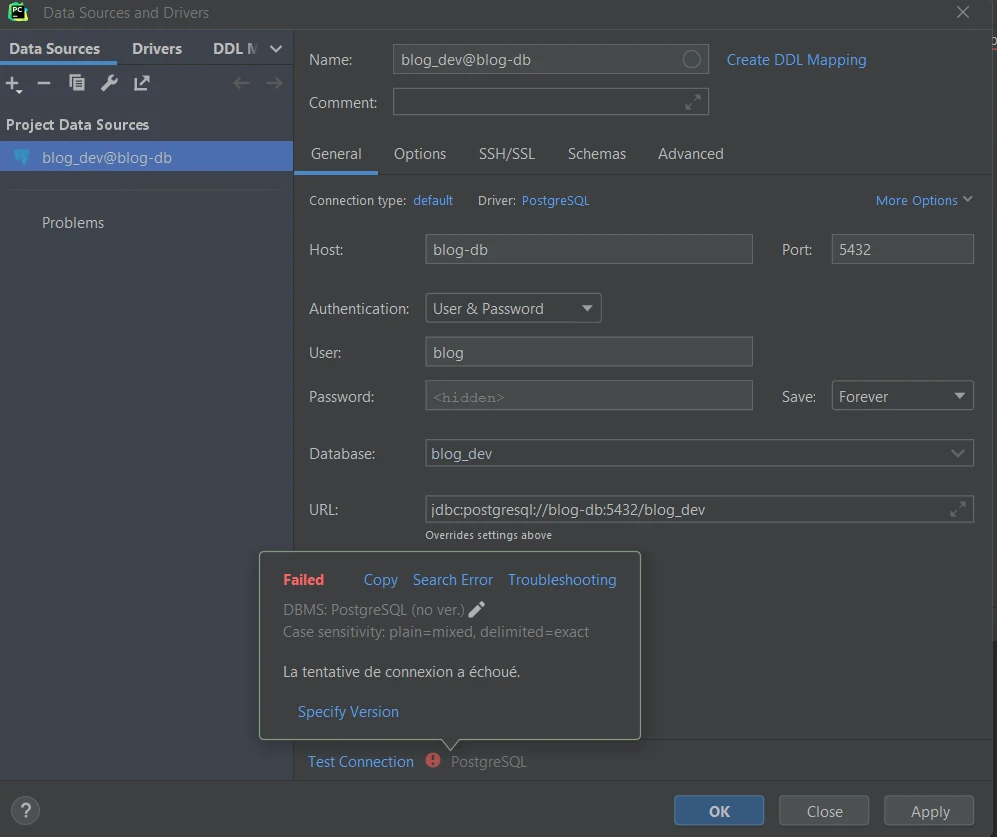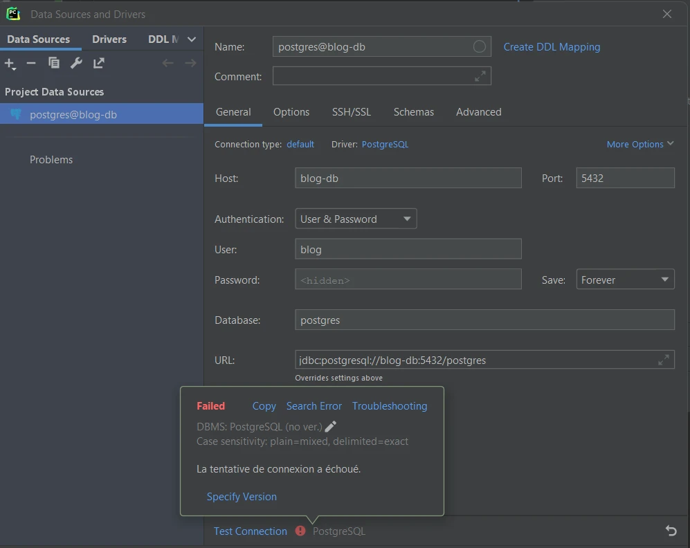Je ne vois pas de ports exposés dans ton service de blog-db dans otn docker compose comme tu le fais pour ton service blog et rabbit. Du coup peut être que c'est la raison pour laquelle tu n'arrives pas à y accéder depuis l'extérieur , c'est à dire depuis pycharm.