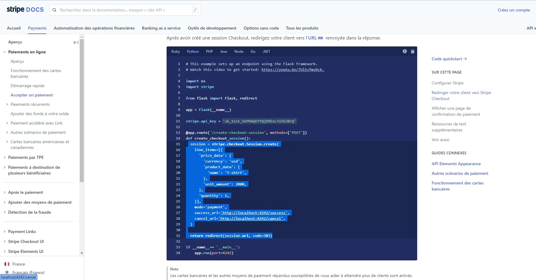 mais il aurait fallu définir un produit a vendre dans stripe avant de copier le code