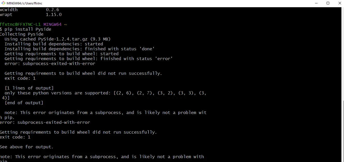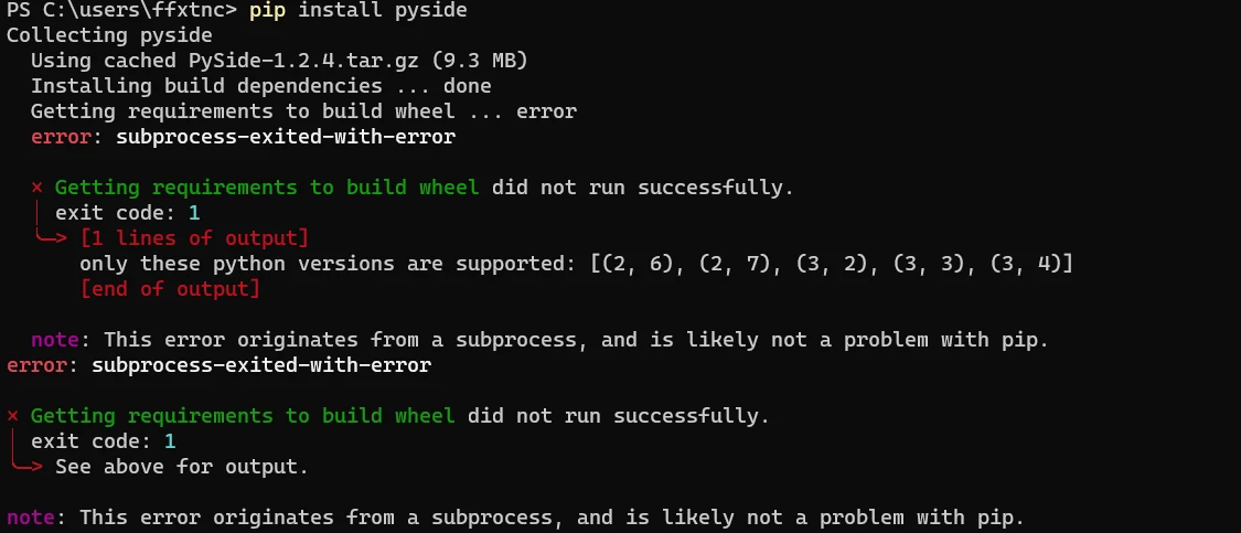 Regardes sur le message d'erreur il t'indiques que seules les version de python [(2, 6), (2,7),(3,2), (3, 3), (3,4)] sont compatibles avec la version pyside qu etu cherches à installer. Il faut a prioir utiliser Pyside2 si tu as une version de python > 3.5
