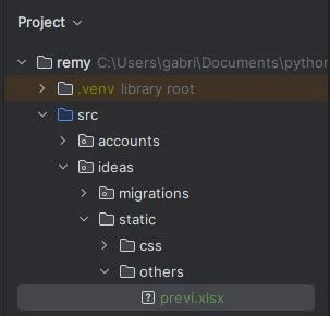 Dans mon application ideas j'ai un dossier static avec un sous dossier others et un fichier previ.xlsx.