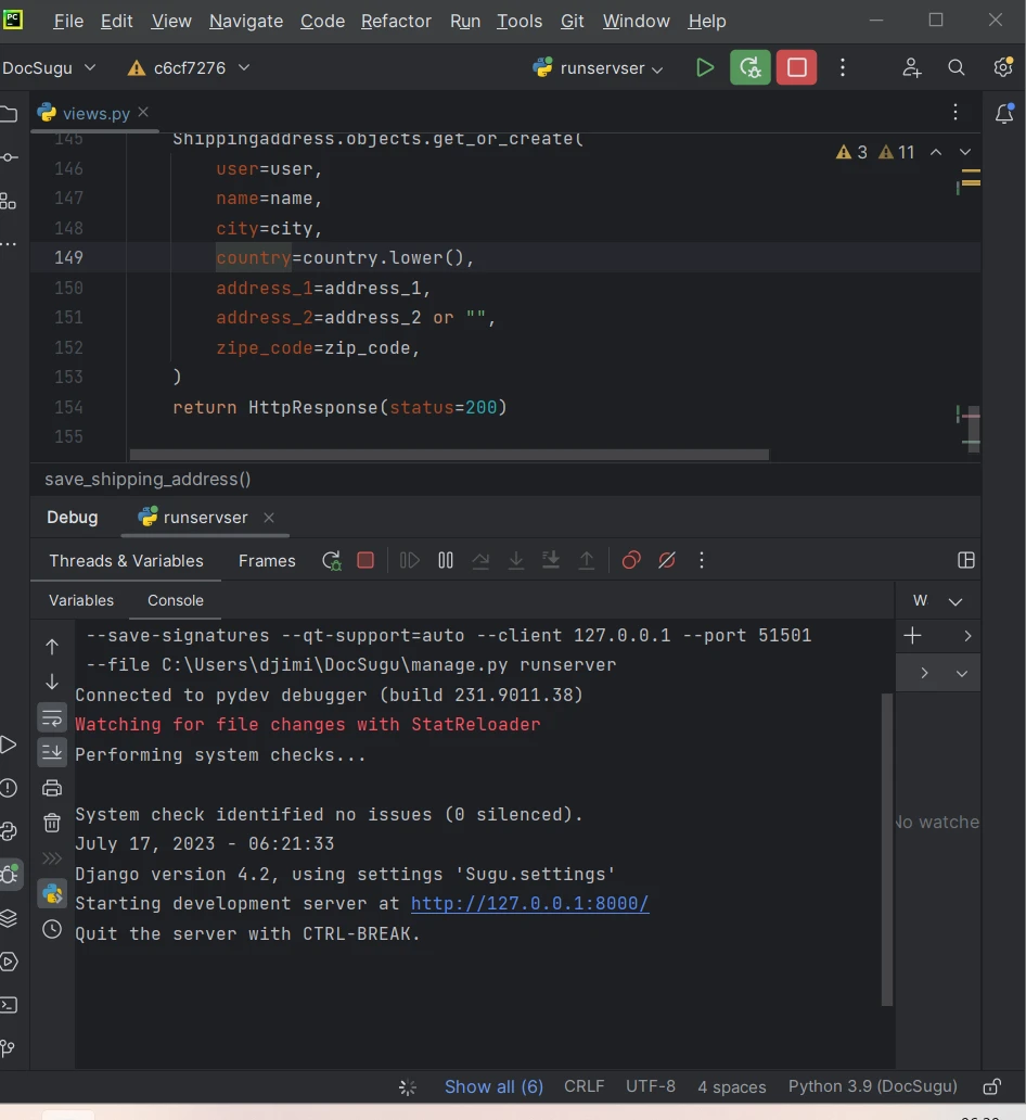 Tu as fait un peu de debug du côté de ta fonction save_shipping_address ? Tu utilises PyCharm ou VS Code (ou autre) ?