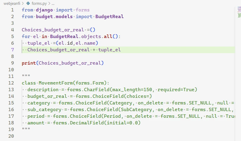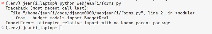 Généralement, on ne lance pas les fichiers individuellement comme tu le fais avec python webjeanfi/forms.py dans un projet Django. À la place on utilise la commande manage.py pour exécuter des tâches comme lancer le serveur de développement ou créer des migrations. Si tu veux exécuter un script qui utilise des parties de ton application Django (comme des modèles dans budget.models), c'est possible, mais tu dois te débrouiller pour que ton script soit exécuté dans le contexte de Django.