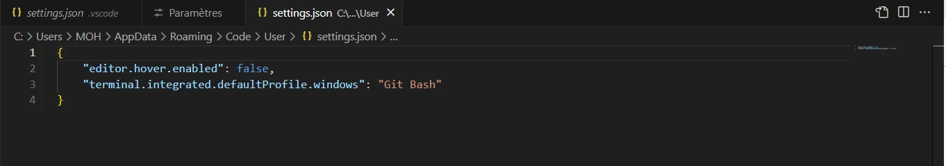 En revanche, concernant les settings JSON, tu me dis que seuls les paramètres modifiés apparaissent. Mais dans ce cas, comment modifier les autres directement dans le JSON comme tu as pu le faire dans une de tes vidéos ? Voilà ce qu'il m'affiche quand je clique sur le bouton en haut à droite: