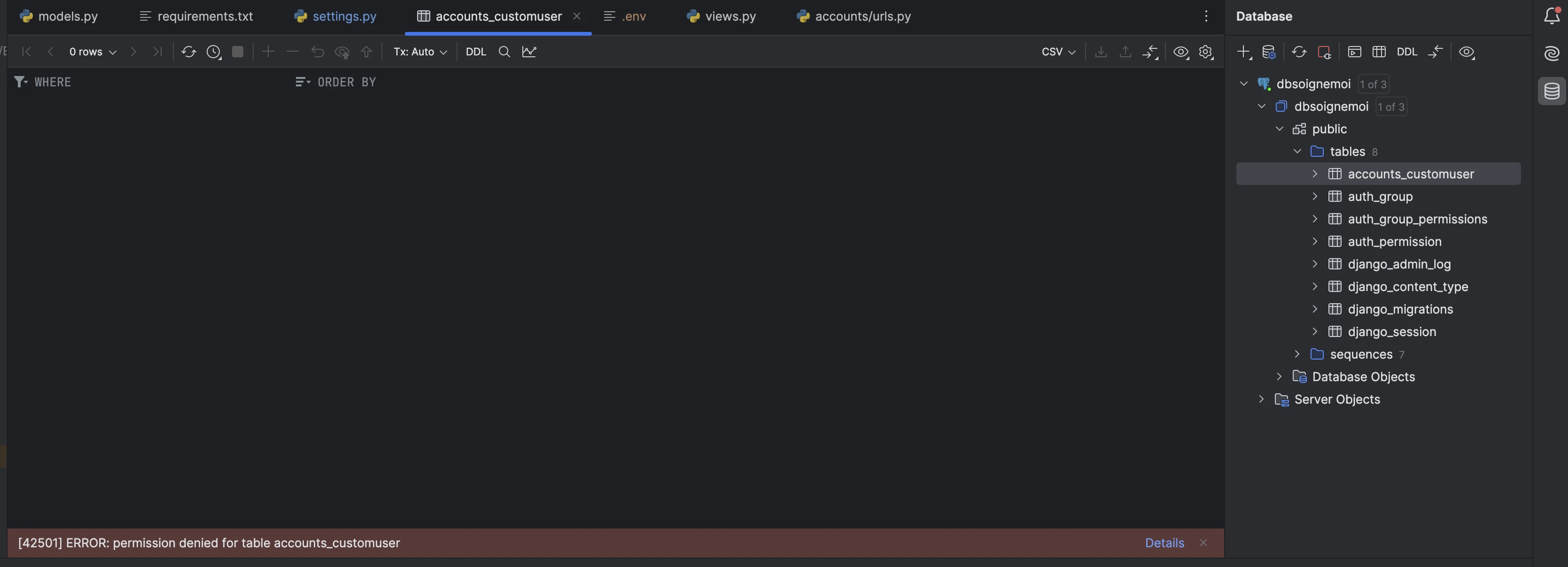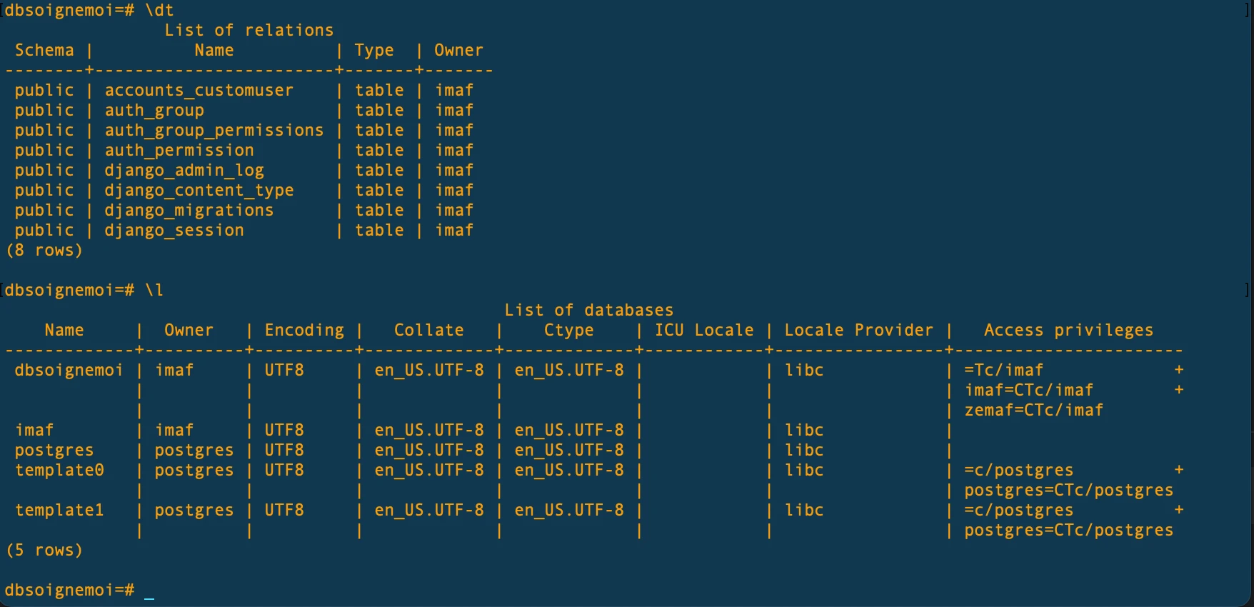 Bonjour, dans un projet perso, lorsque je me connecte à ma base de donnée, je ne vois pas apparaitre le nom de l'utilisateur ('zemaf') que j'ai créé, dans la colonne 'owner' (suite à commande \dt), seul le super utilisateur ('imaf') apparaît (comme si 'thibh' apparaissait à la place de 'docuser'). Par contre les droits apparaissent bien en face de la bdd après la commande \l.