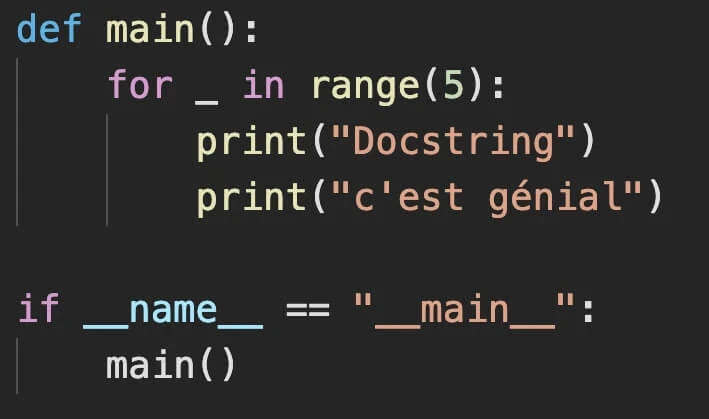 def main(): for _ in range(5): print("Docstring") print("c'est génial") if __name__ == "__main__": main()
