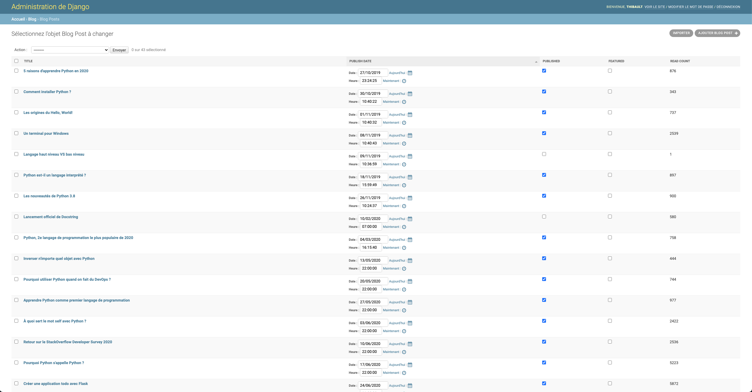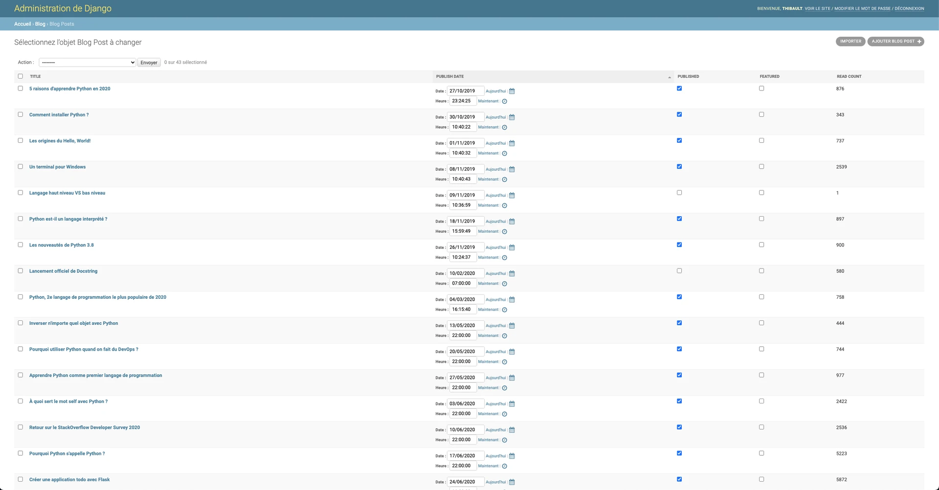 Prenons l'exemple d'un modèle d'articles de blog (BlogPost) avec le code suivant dans le fichier admin.py de l'application blog :