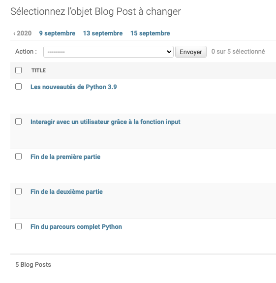 Vous remarquerez que là encore Django est suffisamment intelligent pour n'afficher que les informations pertinentes. Une fois arrivé au mois de septembre, seulement 3 dates sont affichées, correspondant aux 3 dates auxquelles j'ai publié des articles :