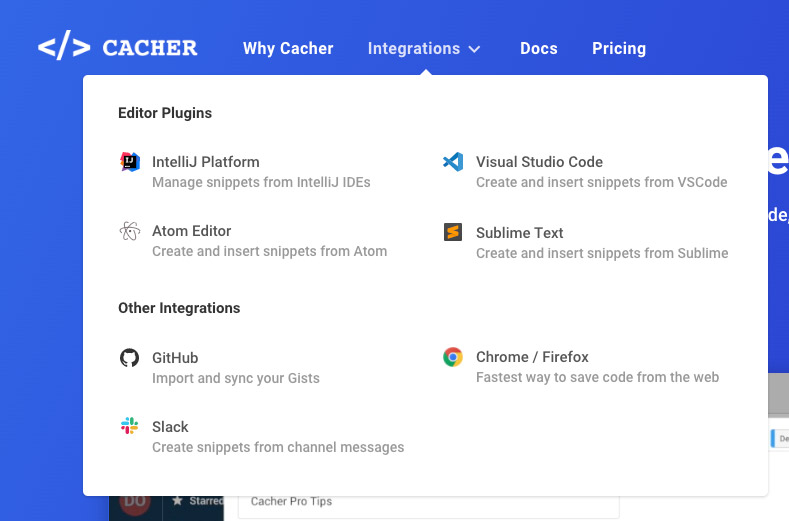 Là encore Cacher possède plusieurs plugins qui vous permettent de l'intégrer directement dans la plupart des éditeurs de code comme Visual Studio Code, PyCharm, Atom ou encore Sublime Text.
