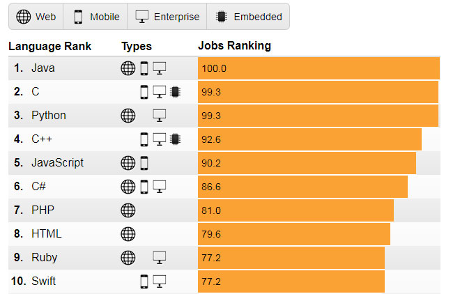 Si l'on s'intéresse à d'autres données, cette fois-ci de L’Institute of Electrical and Electronics Engineers (IEEE, la plus grande association mondiale de professionnels techniques), on se rend compte que Python est en bonne position en ce qui concerne les offres d'emploi :
