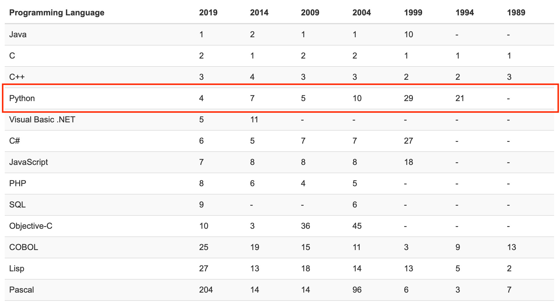 Si on regarde l'évolution de la popularité des différents langages de programmation sur le long terme, on se rend compte des bonds de géant que fait Python qui passe de la 12e place dans les années 2000 à la 1ère place aujourd'hui.