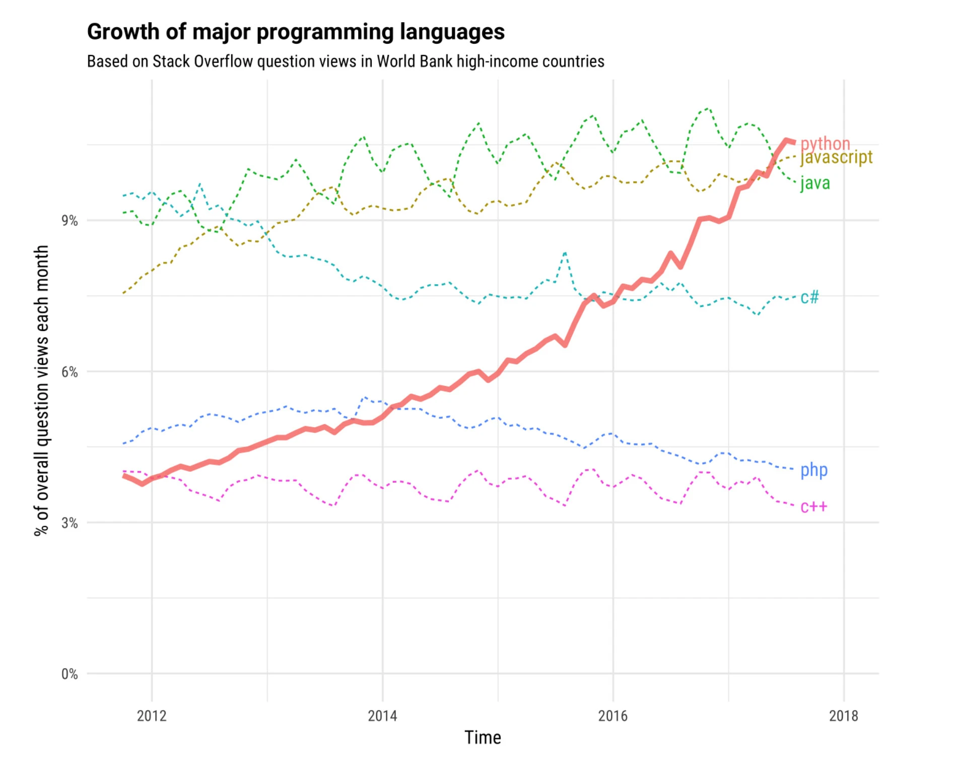 Si l'on se fie cette fois-ci aux statistique de StackOverflow, un site web parmi les plus populaires pour poser des questions sur de nombreux langages de programmation, on voit que Python est également haut dans le classement :