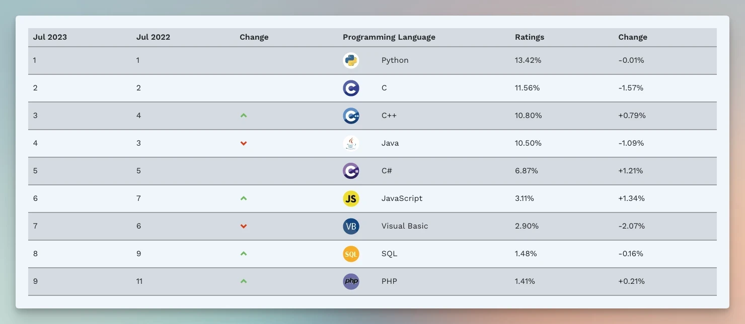 Python est désormais le langage le plus populaire devant C, Java et JavaScript selon TIOBE, un institut qui se base sur de nombreux facteurs (nombre de recherches, nombre de formations en ligne, nombre d'ingénieurs qualifiés...).