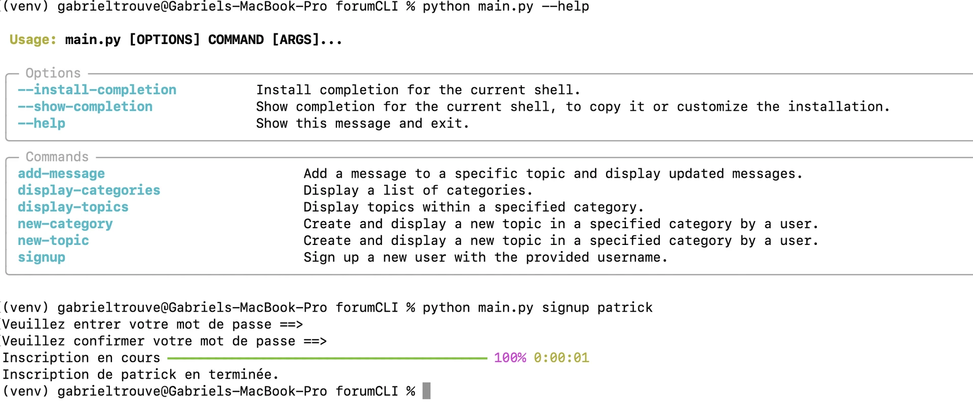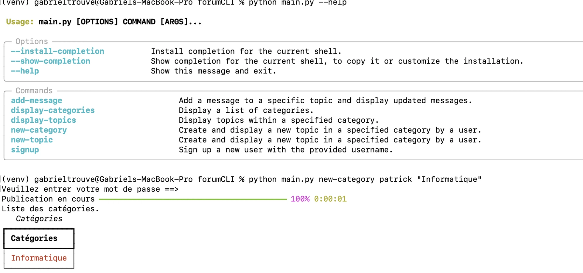 Le forum en ligne de commande, avec création de compte (mot de passe inclu), affichage des catégories et sujets, et la possibilité de poster un message.