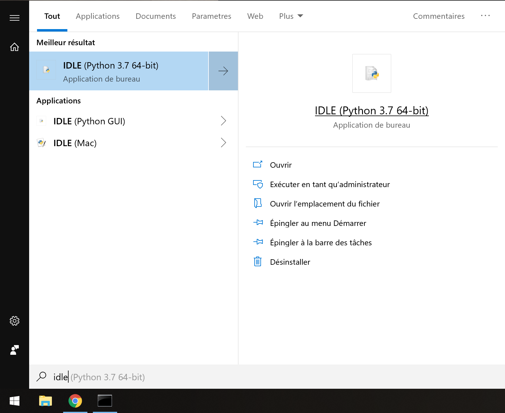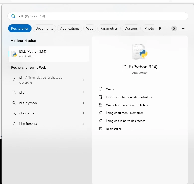 On peut même lancer IDLE en faisant une recherche dans la barre de recherche Windows :