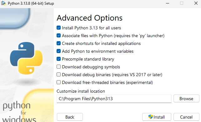 Add python.exe to PATH vous permettra de lancer l'exécutable Python dans une invite de commande en tapant uniquement le nom du fichier (python) au lieu de devoir entrer le chemin complet vers l'exécutable.