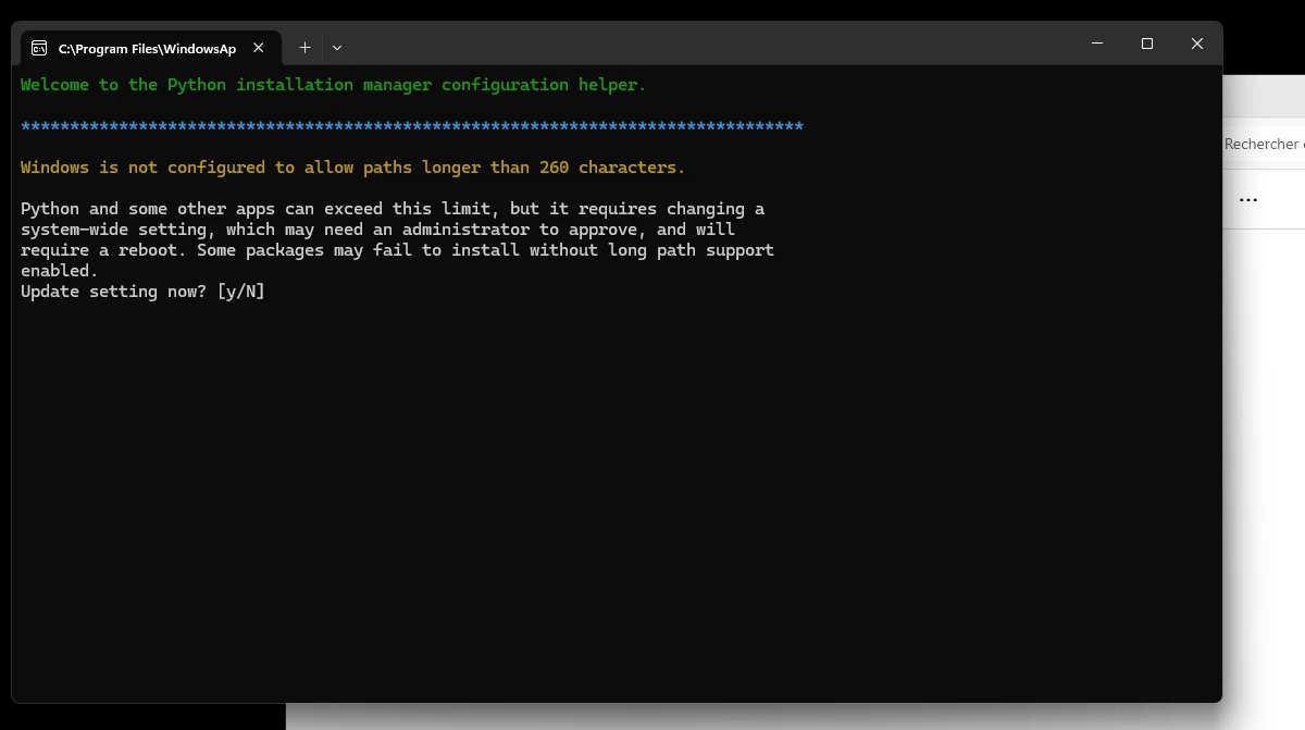 Vous aurez potentiellement accès à une option pour changer Windows qui limite le nombre de caractères dans les chemins de fichiers et qui peut poser des problèmes avec vos scripts Python.