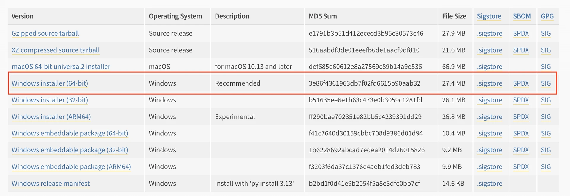 Pour Windows, les deux seuls fichiers qui nous intéressent sont les installeurs pour les versions 32 bits et 64 bits.