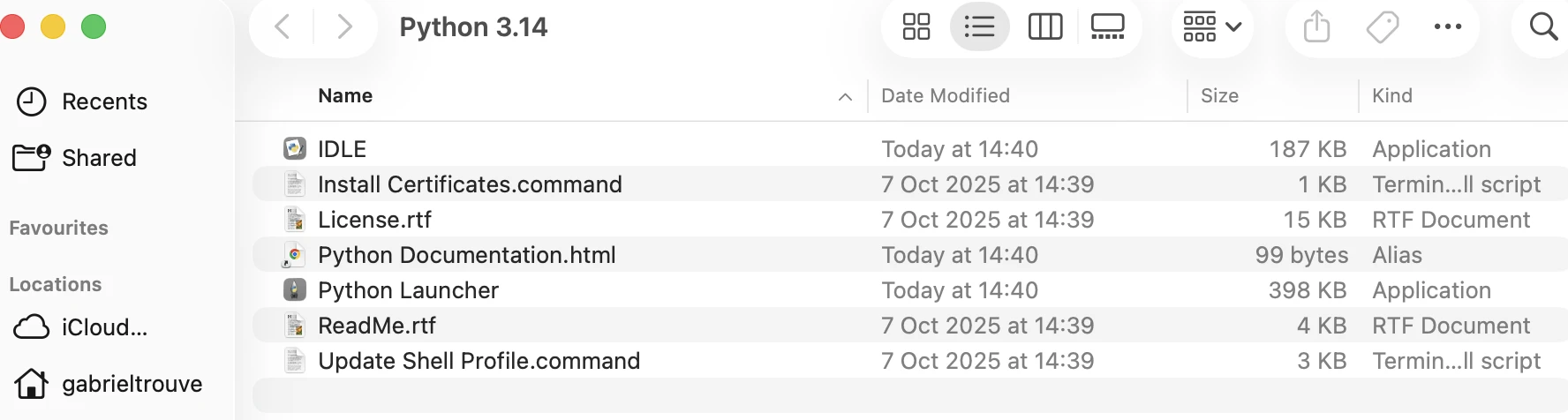 Par défaut, les fichiers se trouvent dans /Applications/Python 3.14/