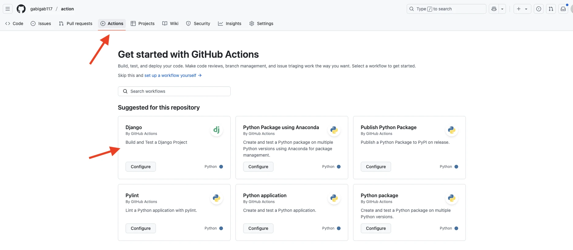 Vous pouvez ensuite depuis votre dépôt sur Github, cliquer sur l'onglet Actions et utiliser un template Django existant (s'il n'apparaît pas directement, vous pouvez utiliser le moteur de recherche).