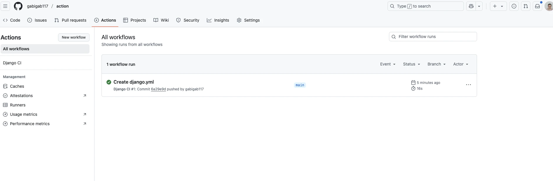 En sélectionnant le template Django via le bouton Configure, un fichier est créé dans .github/workflows/django.yml.