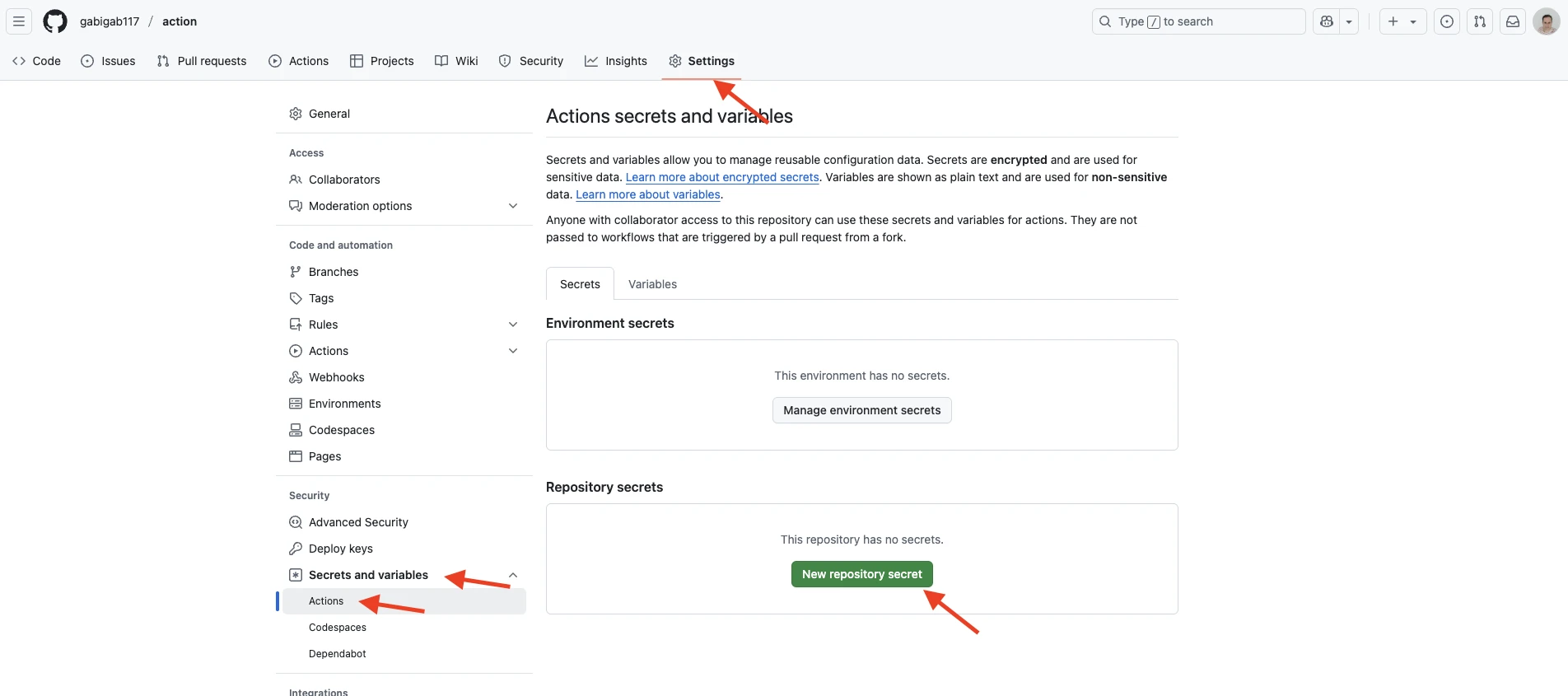 Pour ce faire, il suffit d'aller dans le menu Settings > Secrets and variables > Actions et cliquer sur New repository secret.