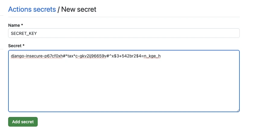 Une fois les secrets configurés (dans cet exemple je n'ai configuré que la clé secrète de Django), il faut la référencer dans le workflow :