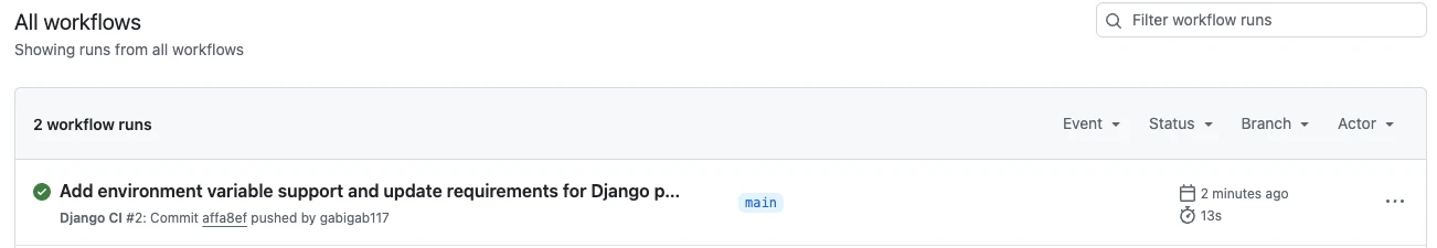 N'oubliez pas d'ajouter django-environ au fichier requirements.txt. Sinon, le package ne sera pas installé au moment de l'exécution du workflow.