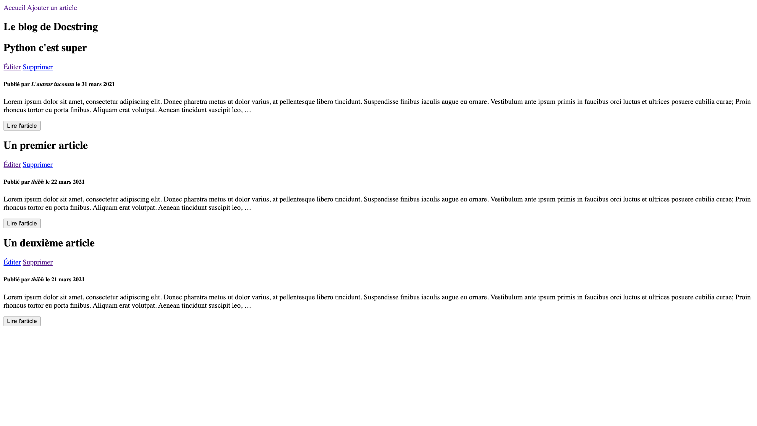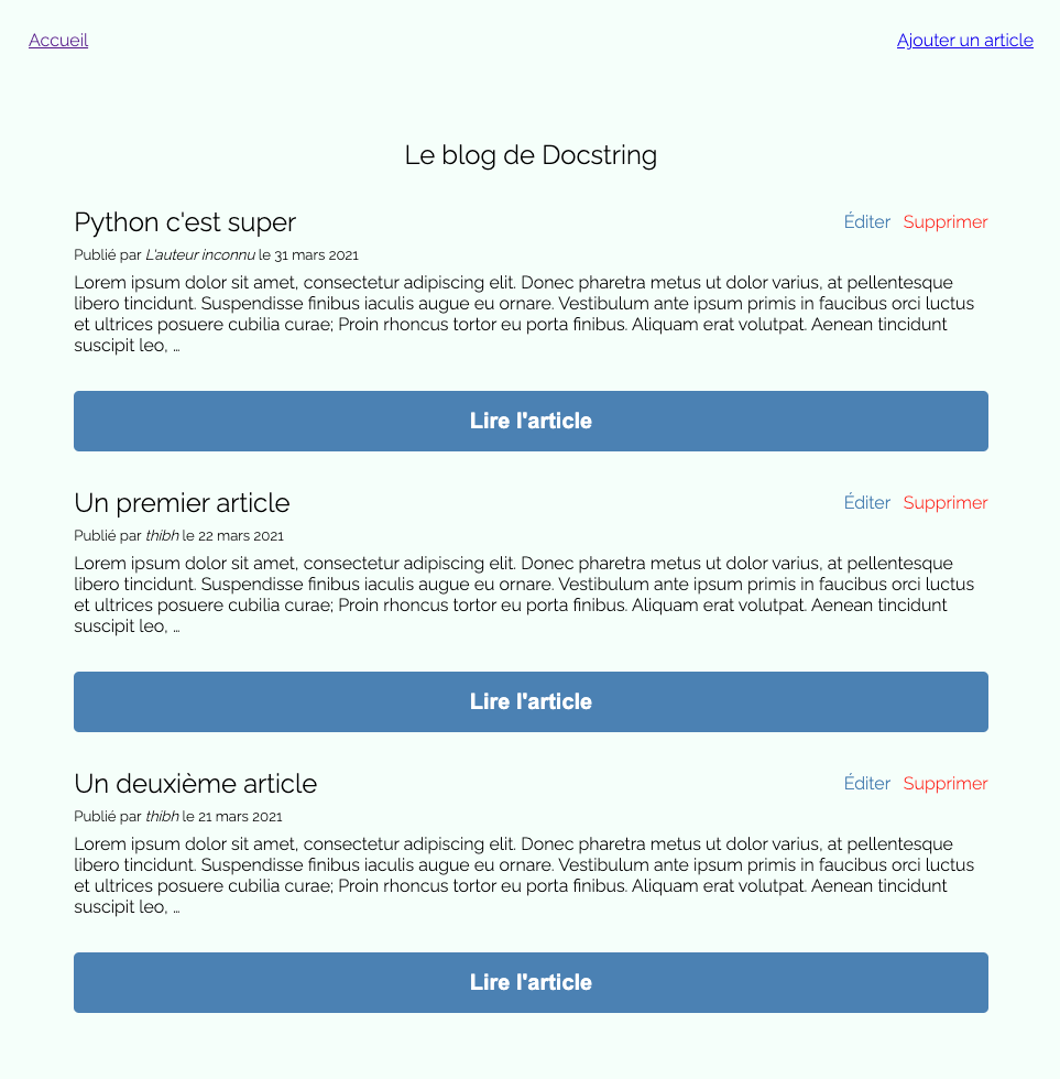 Mais un blog tout de même 100% fonctionnel, avec la possibilité de créer des articles, de les afficher, les modifier et les supprimer, tout ça grâce notamment aux vues fondées sur les classes (Class Based Views) de Django.