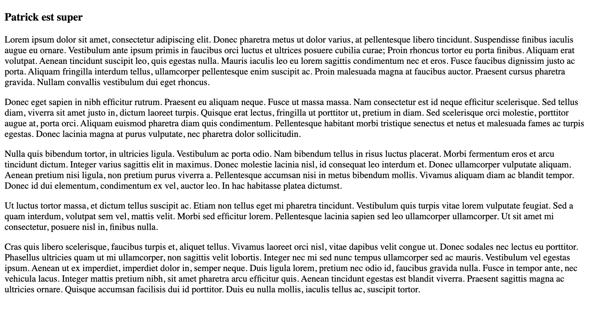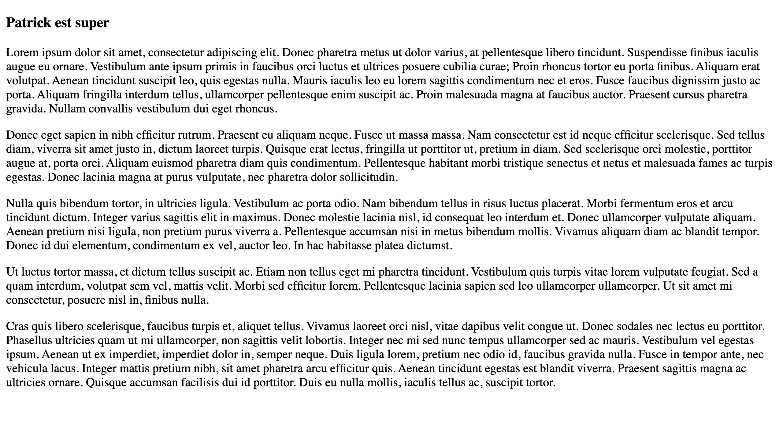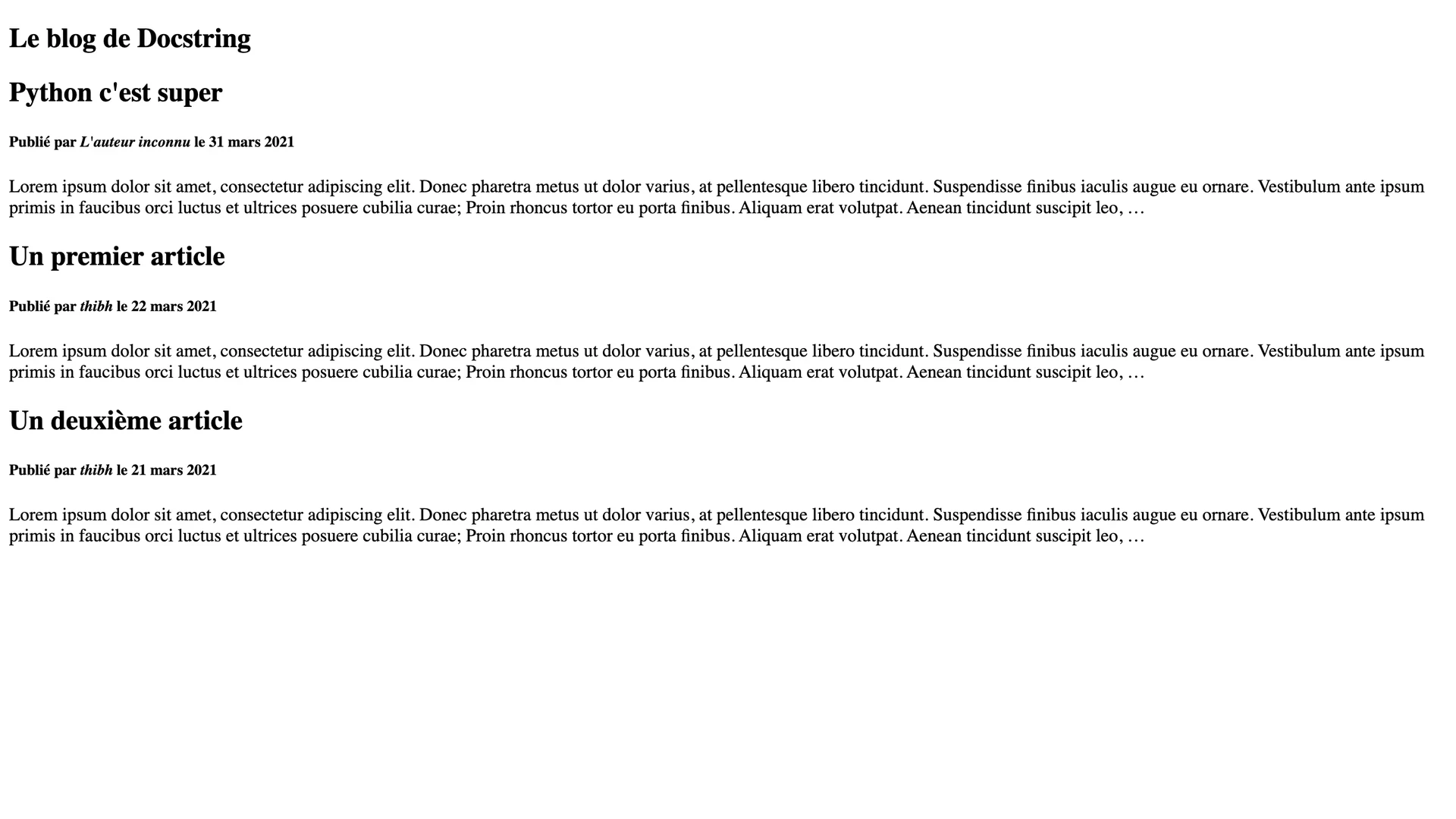 Et voilà, on peut maintenant afficher un article en lançant le serveur et en se rendant à l'adresse http://127.0.0.1:8080/blog/patrick-est-super/ (dans le cas d'un article vantant les mérites de Patrick) :