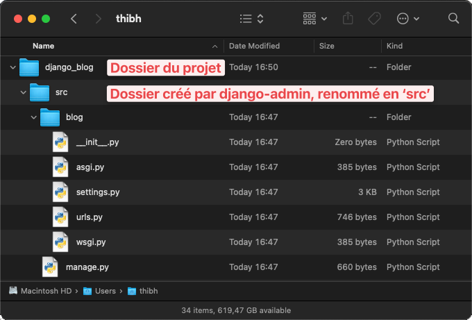 Personnellement, j'aime bien renommer le dossier racine créé par Django par src. Je peux le faire directement depuis le terminal avec la commande mv (move) :
