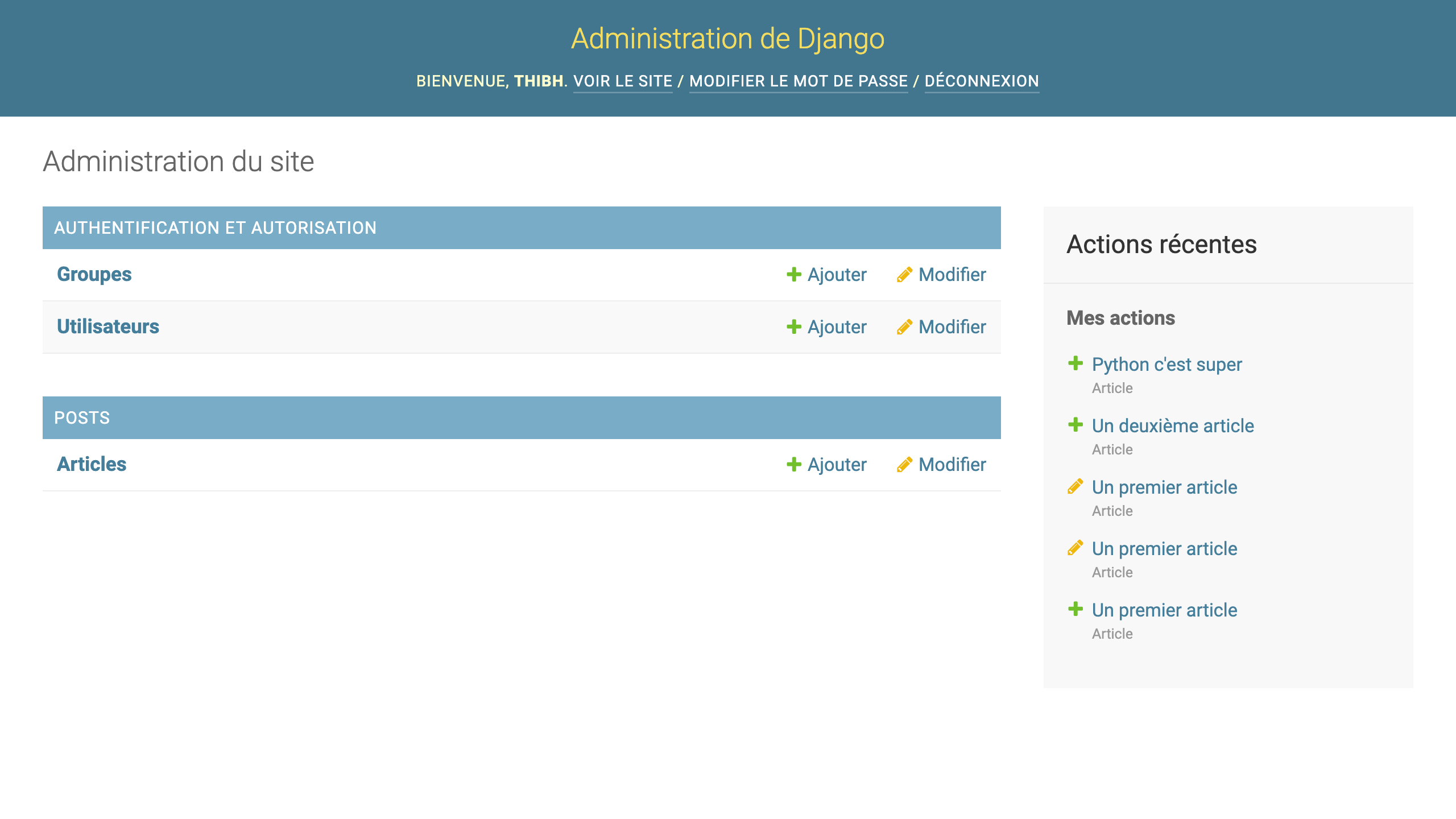 Si vous vous rendez dans votre interface d'administration, vous devriez maintenant avoir la possibilité d'ajouter un article, de les modifier, les supprimer et visualiser les articles de votre base de données.
