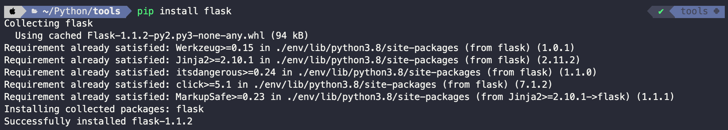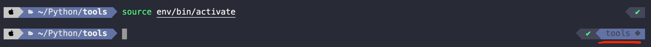 Le terminal m'indique que j'ai bien activé l'environnement virtuel pour mon projet 'tools'.